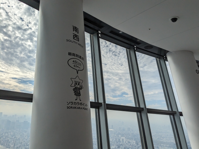 スロープを進んで行くと、スカイツリー展望台の最高到達点に到着。マスコットキャラクターのソラカラちゃんが教えてくれました。その高さは451.2m。山々と比べるとそれほど高く感じない数値ですが、大都会の真ん中でこの高さに立てるというのは他にはない唯一無二の体験です。