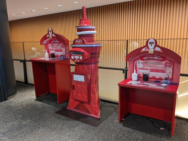エレベーターで地上へと戻ると、出口に設置にされていたのはスカイツリーポスト。以前は天望デッキに設置されていましたが、2023年11月時点ではスカイツリータウンの5階に置かれていました。実際に投函することができる郵便ポストであり、天望デッキに置かれていたときは、「建物内にあるポストの中では日本最高所」であったそうです。