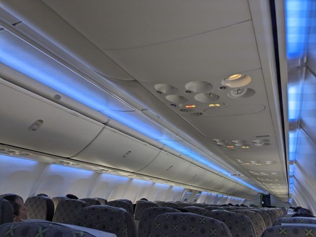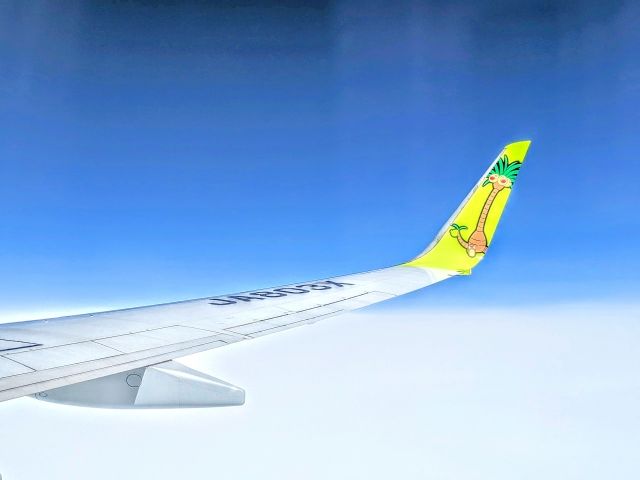 出発35分前となる9:20に保安検査場を通過して機内へと乗り込みます。なんと、歩く熱帯雨林とも称されるポケモン「ナッシー」がラッピングされたナッシージェットでした!南国感あふれるチョイスに気持ちが高まります。