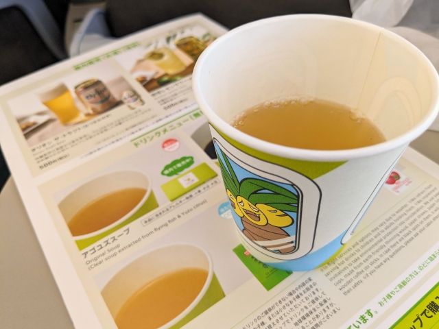 機内サービスのドリンクは、コーヒー、アップルジュース、お茶に加えてオリジナル商品の「アゴユズスープ」が。長崎県産のトビウオ(あご)の出汁と、大分県産のユズで仕上げられた、九州味が詰まったスープです。ちなみに紙コップにもナッシーがいます。