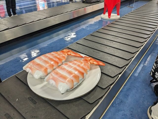 定刻より7分ほど遅れて11:47に大分空港に到着。天気は雨。荷物受取所のコンベアで待機していると、何故か寿司がまわってきました。