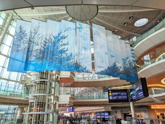 第2ターミナルの見どころといえば、千住博アートワークス。日本画家である千住博さんの作品が5ヶ所に展示されており、空港を神秘的に彩ります。吹き抜け空間に下がる「風の渓谷」は、室内なのに風を感じさせる作品です。