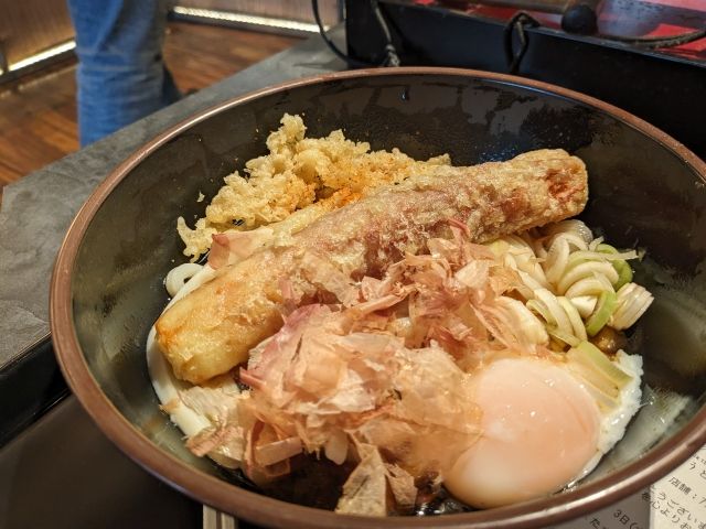 さて、朝ごはんにしよう!時間に余裕があるので、コンビニではなくお店に入ることに。悩んだ末に選んだのは讃岐うどんの「般若林」。讃岐うどんはすぐ出てくる、安い、すぐ食べ終わると旅行にはぴったりなメニュー。頼んだ「ちくたまぶっかけうどん」はつるつるしこしこな麺に、鯛ちくわがのった絶品でした。