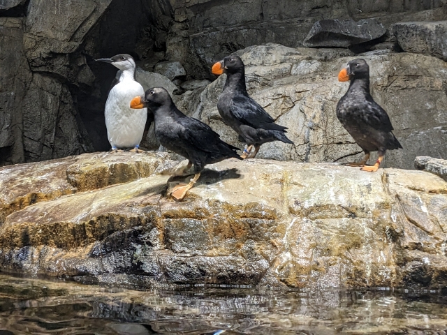 ペンギンに見えますが、こちらはまったく別の鳥。黒い羽毛にオレンジ色のクチバシがエトピリカ、モノトーンの方がウミガラスという種類になります。どちらも水中を泳ぐことができる鳥類。翼を使ってかなりハイスピードに泳ぐので、水中を飛んでいるかのようです。