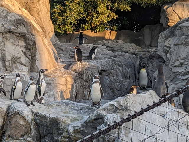 小型のフンボルトペンギンに混じって、よくみるとオウサマペンギンの姿も!他のペンギンよりもずっと大きく貫禄があり、名前に違わぬ王様オーラを放ちます。写真の右奥に佇んでいるのですが、見つけられますか・・・?
