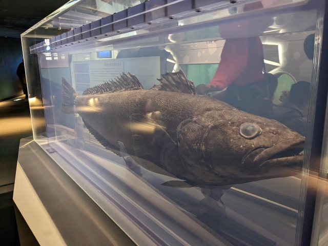 こちらの大きなサカナの標本はアンタークティックトゥースフィッシュ。南極海最大級のサカナで、第57次日本南極地域観測越冬隊員が2016年に釣り上げたもの。日本ではライギョダマシとも呼ばれています。