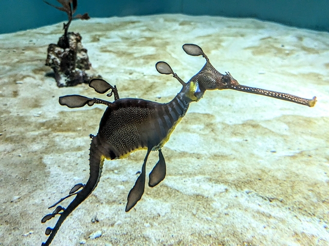 タツノオトシゴの進化系のような姿のウィーディシードラゴン。ただ流れにまかせているように見えますが、実は透明な胸ビレと背ビレをめっちゃ小刻みに動かしてます。