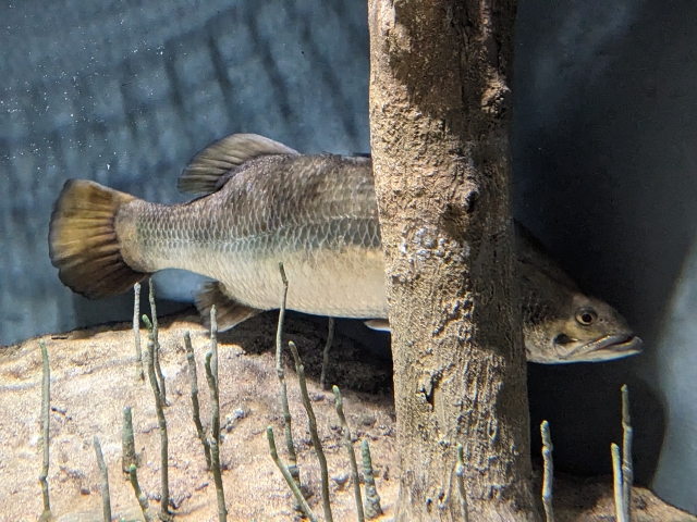 「世界の海」エリアをはじめ、世界中の個性的な生き物を多数展示しているのも特徴の一つ。木の影でじっとしている大きな魚はバラ・ムンディ。オーストラリアに生息しているアカメの仲間です。