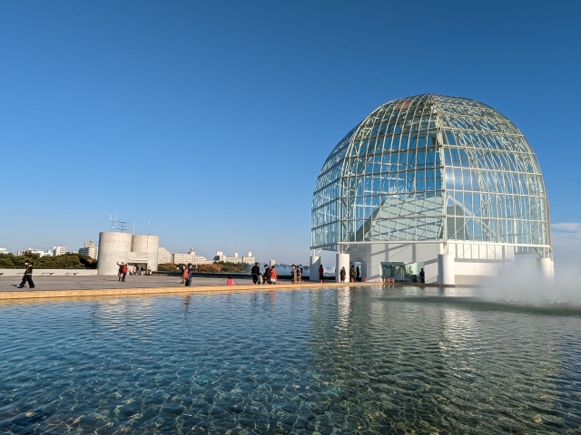 葛西臨海公園内を進んでいくと、目に入るのが地上30mを超える巨大なガラスドーム。こちらは1992年にオープンした水族館・葛西臨海水族園。インフィニティプールのように広がる水辺に建つ姿はなんともフォトジェニックで、晴れた日に訪れたい水族館です。