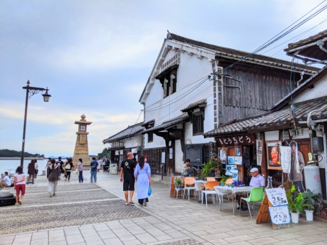 常夜灯のまわりは、カフェ、うどん屋さん、いろは丸展示館が並ぶにぎやかなエリア。波止場の開放的な気分でとても良い雰囲気です。