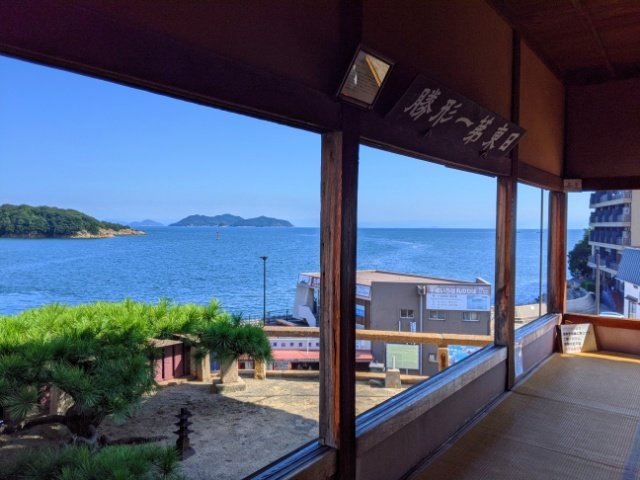 窓枠を額縁に見立てて、風景を切り取って見るのがこの対潮楼の楽しみ方。海の上には、多宝塔のそびえる弁天島、その隣にある皇后島、後ろにある大きな仙酔島が見えます。