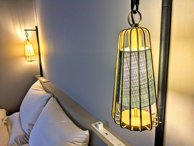 ベッドライトもおしゃれなデザイン。こちらは能登上布という伝統的な麻の着物の帯生地を使用しているそう。