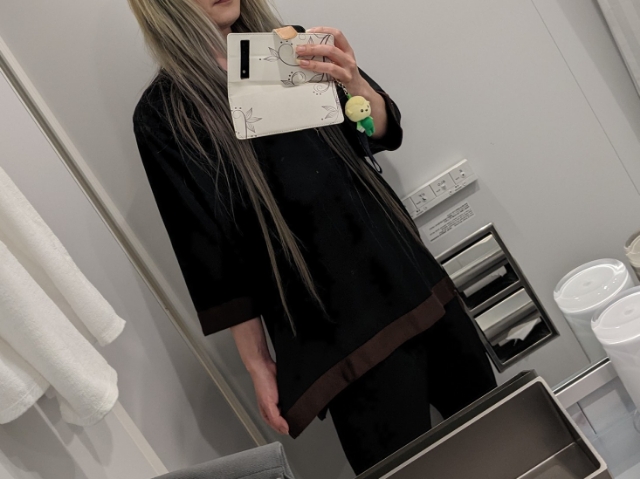 館内着は黒字にブラウンのラインが入ったシックなデザイン。浴衣やガウンではなく、上下セパレートタイプなので寝相が悪くても安心。ポケットもあって快適です。