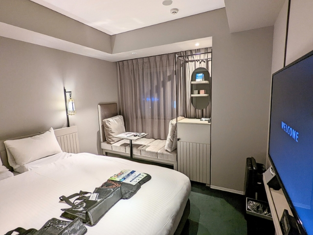 こちらが今回宿泊したお部屋。そんなに広くはないのですが、要所要所にちょっとした物置きがあったり、コンセントも多数あったりと細部まで使いやすさへのこだわりを感じます。
