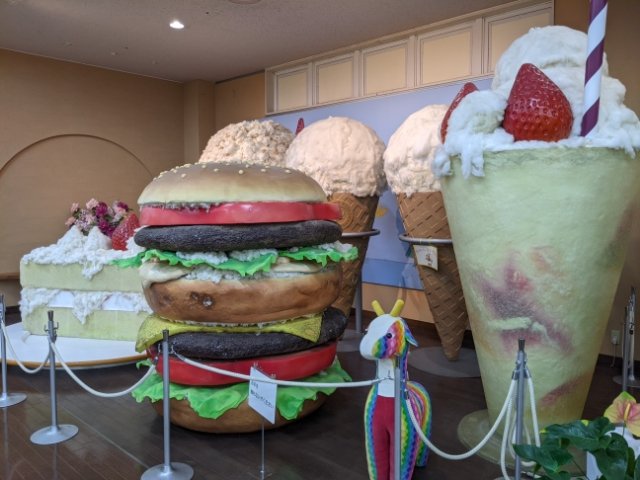 入口にはハンバーガーやソフトクリームなど美味しそうなモチーフで作られた巨大なオブジェが並びます。こちらは全てタオルの原料である綿で作られたタオルアート。よく見ると繊維がしっかりと見えます。