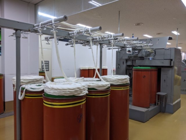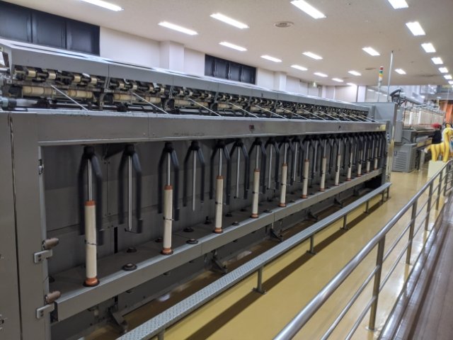 スライバーを引き伸ばしてボビンに巻きつけていく粗紡(そぼう)機。たくさんのアームがくるくると回っている様子は、「ディズニーファンタジアのほうき」のようでなんだかコミカル。ずっと眺めていられます。