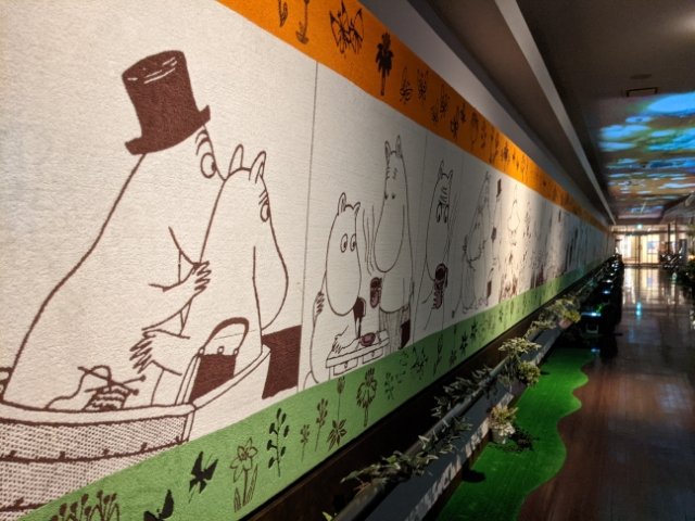 壁には、40mという超ロングタオルに描かれたムーミン。タオル美術館創立15周年とムーミンの作者トーベ・ヤンソン生誕100周年を記念して行われたコラボ作品で、様々なキャラクターが描かれています。