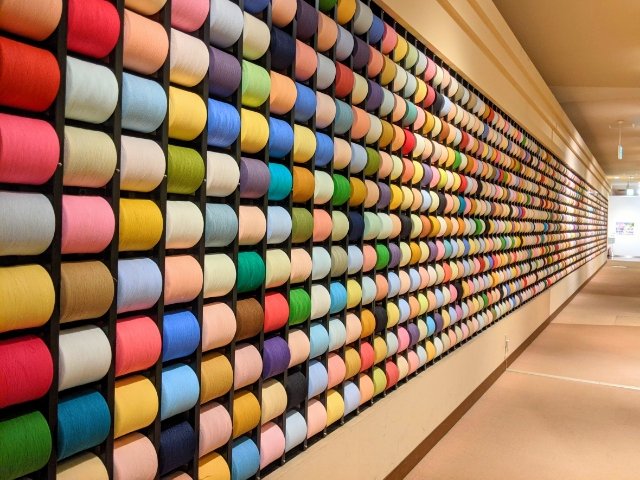 壁にはフォトスポット「チーズ巻糸の壁」。200色、1,800本もの巻糸がびっしり!カラフルでとっても写真映えする光景です。