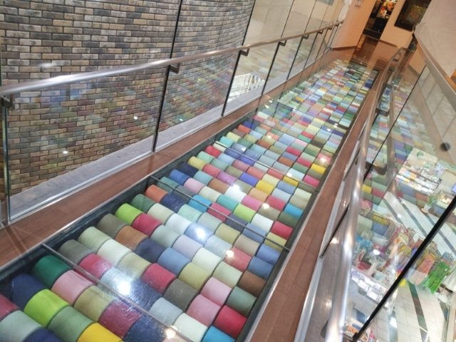 壁だけでなく、チーズ巻糸が敷き詰められた橋もあります。ガラス床で覆われているため滑ることはありませんが、なんだかローラー滑り台を思い出しました。