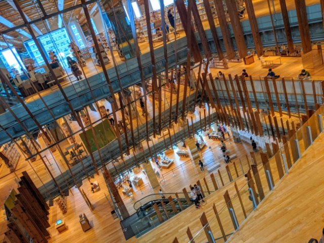 どこから見ても写真映えするデザインで、それぞれの階の様々な角度からカメラを向けたくなります。このむき出しの木材が並ぶ様は、ご存じ隈研吾の設計によるもの。かなりインパクトのある内装ですが、木の温もりのおかげで不思議と心が落ち着きます。
