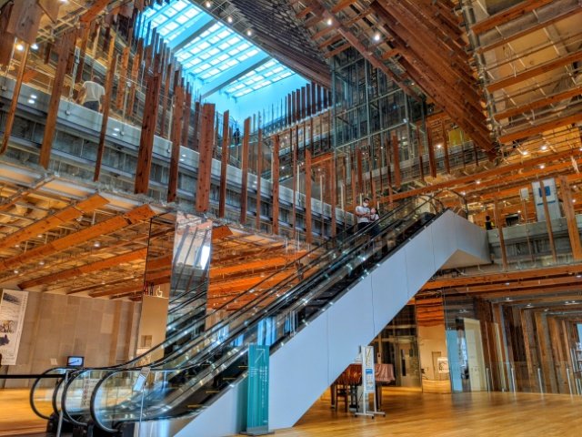 とにかく目を引くのはこの独創的な建築。6階まで吹き抜けとなっており、その広い空間の中をエスカレーターで登っていきます。最上部に広がる大きな窓からは自然の光が各フロアに降り注ぎます。