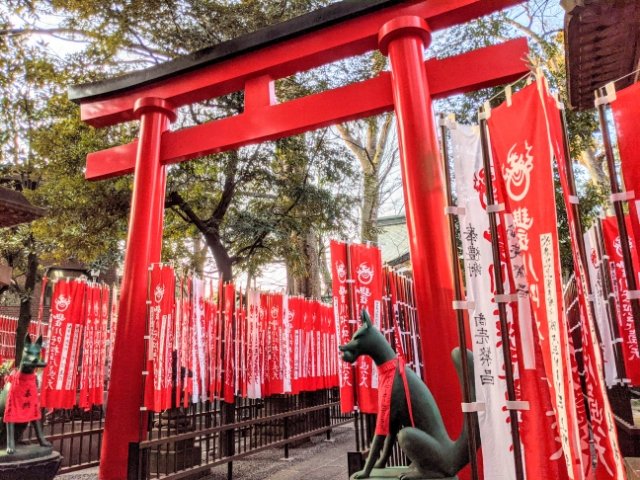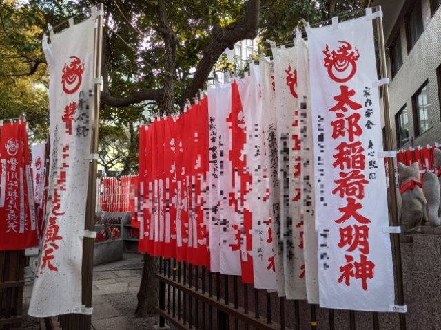 伏見稲荷大社や元乃隅稲成神社のように、赤い鳥居がズラッと並ぶ光景は、稲荷神社ではおなじみ。ここ豊川稲荷東京別院は、鳥居ではなく真っ赤なのぼりが大量に並んでいます。