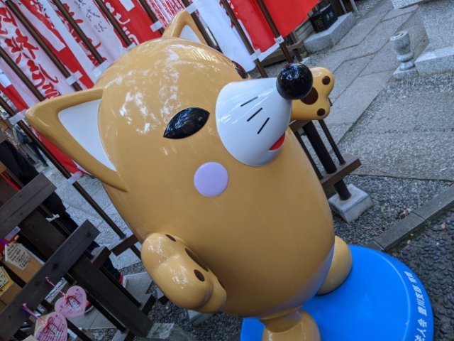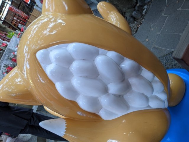 千本のぼりやキツネ像を眺めて散策していると、ひときわゆるーいテイストのキツネを見つけてしまいました。