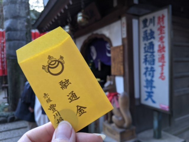 こちらは融通稲荷。お参りと同時に融通稲荷銭という、黄色い紙袋に入った10円玉をお借りすることができます。こちらをお財布に入れておくと金運上昇が見込めるそう。一年経ったら礼金として奉納するという習わしなので、きちんと返しに行くのをお忘れなく!