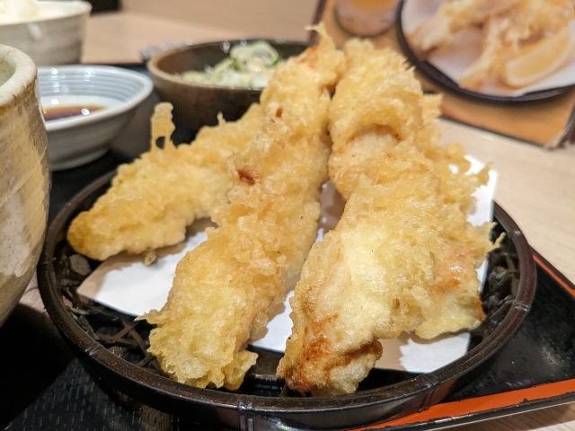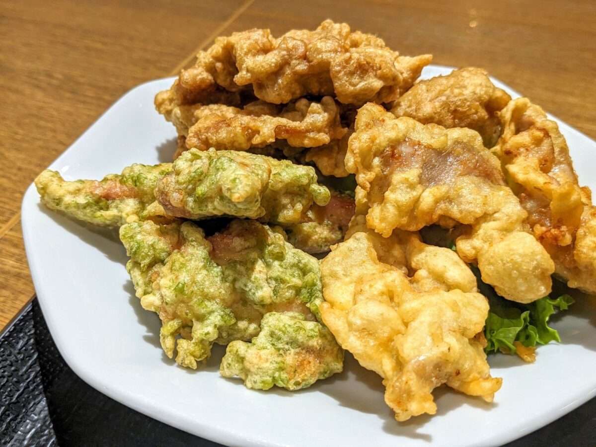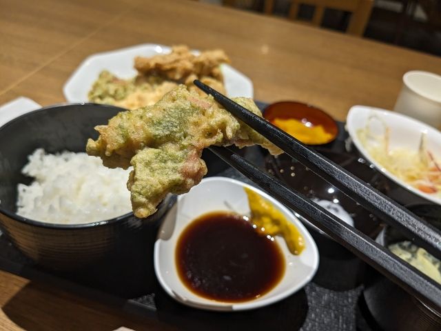 文句なしで美味なのが「あおさとり天」。磯部揚げのような風味がたまらないお味。こちらは塩をつけると「のり塩」感が高まっておすすめ。