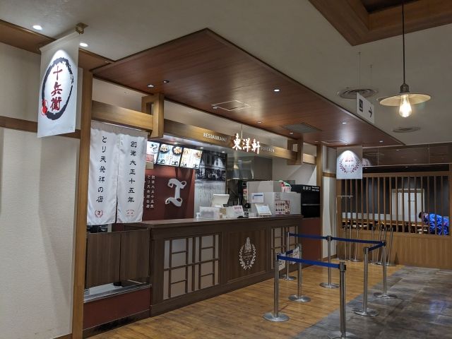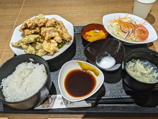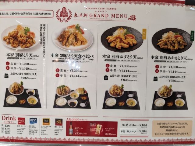 とり天発祥ともいわれるレストラン「東洋軒」。実はフードコートにも出店しており、比較的混雑なく食べることができます。食べ比べ定食を注文すれば、「別府とり天」「ゆずとり天」「あおさとり天」の3種類を一度に楽しめます。