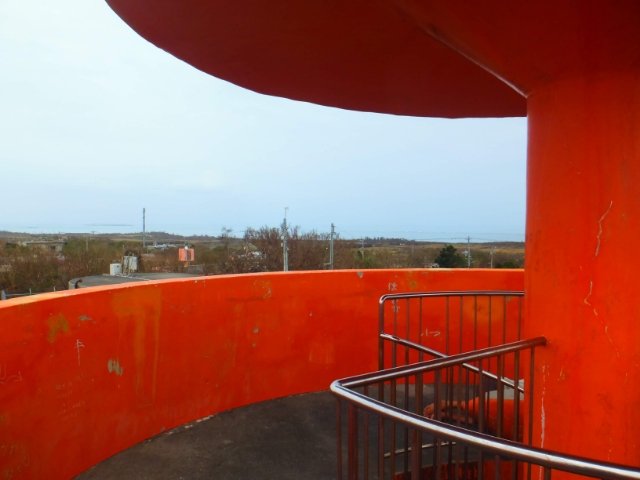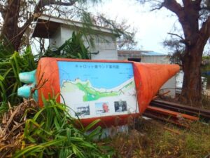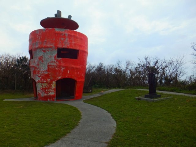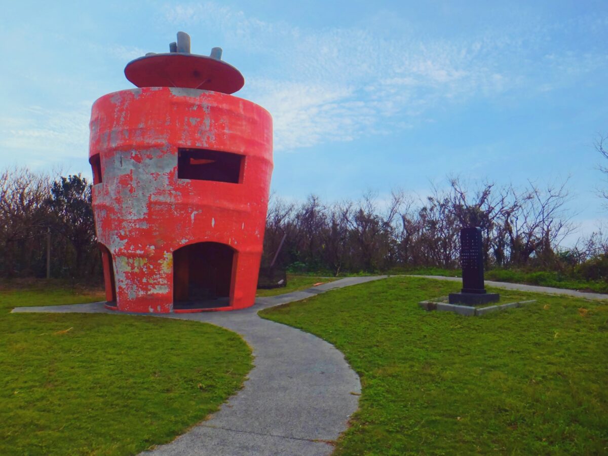 集落から坂道を登っていくと、突如現れる巨大なニンジン。こちらは、津堅島を代表する観光スポットのにんじん展望台。塗装が少し剥げていますが、逆にリアルな根菜感が出ているような気もします。