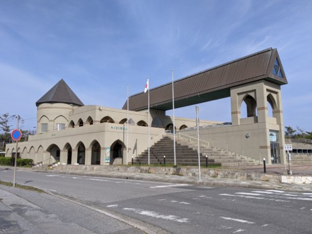 海辺に立つメルヘンチックな月の沙漠記念館。館内では、加藤まさをの年表や紹介映像などを見ることができます。