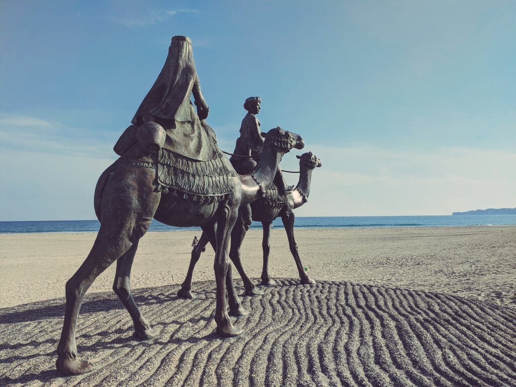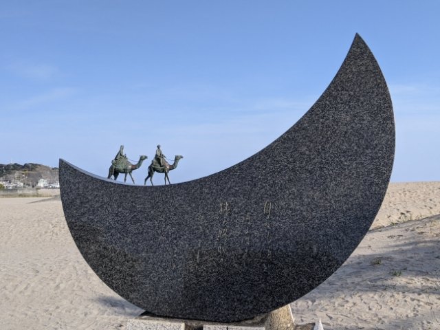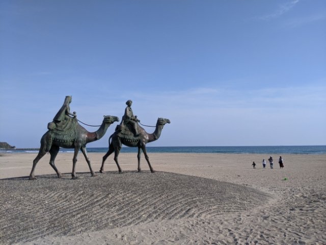月の沙漠記念館の目の前には砂丘が広がる月の沙漠公園があります。海辺に広がる砂の上にはエキゾチックなラクダ像の姿が。詩の一説「さきの鞍には王子様 あとの鞍にはお姫様」とある通り、先頭が王子様・続くのがお姫様となっています。