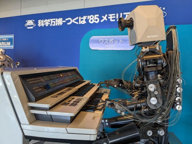 こちらはワスボット。鍵盤楽器自動演奏ロボット。カメラで譜面を読み取り、両手両足を駆使して鍵盤楽器を演奏します。ちなみにワスボットという名前は、開発した早稲田大学の「WA」と住友電工の「SU」にロボットの「BOT」を加えたものです。
