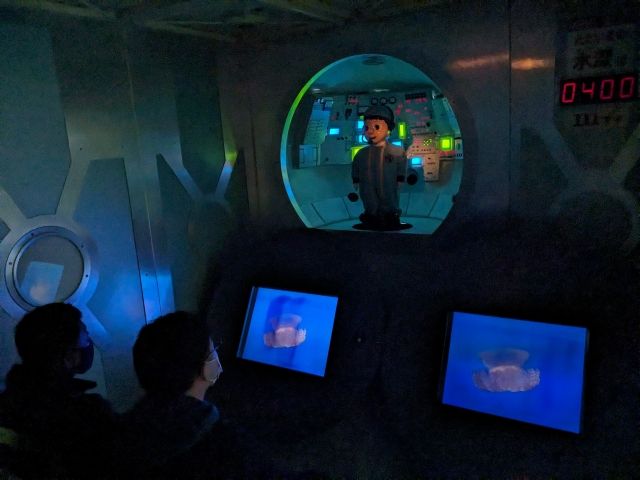 内部は椅子とディスプレイが置かれたシアタールームのようになっています。水深を示すメーターがあり、それに合わせて見える映像も変化。深海へ潜っていく感覚を体験できます。
