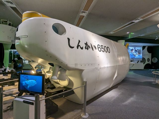 最も大きな展示が「しんかい6500」の3/4模型。その名の通り深海6,500mまで潜ることができる有人潜水調査船です。暗黒・低温・高圧の世界に耐えられるように様々な技術が詰まっています。
