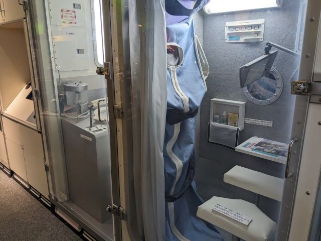 こちらのボックスは国際宇宙ステーションの居住モジュール。縦に備え付けられた寝袋、面ファスナーで壁に固定されたパソコンなど、無重力空間ならではの様子を見ることができます。隣にはトイレもあり、体が浮かないように固定する装置や便を吸い取るホースなども。