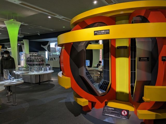 こちらのアトラクションのようなものは「トカマク型核融合装置」。ITER(国際熱核融合実験炉)の1/5模型とのこと。覗き込むタイプの解説映像もありますが、やっぱり難しい!