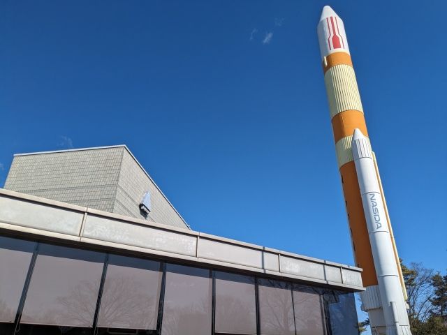 そびえ立つH-IIロケットの実物大模型。高さ50mにも及び、真下から見上げるとその大きさに驚かされます。