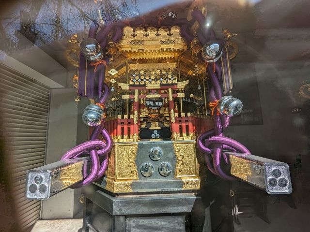 拝殿の右奥へ進むと、神輿展示を見ることができます。「八角神輿」という独特のフォルムのお神輿は、天皇陛下の御座である「高御座(たかみくら)」をイメージしているそう。