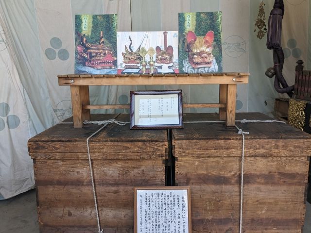 こちらの木箱に納められているのは「龍虎の頭」。上部に掲示された写真を見ると、獅子頭のように見えて左はツノが、右は猫のような耳が生えています。住吉神社の祭礼の際に、この2つの頭を対岸に渡すという儀式があったそう。龍頭は水を、虎頭は砂を吐いて火災を消し止めると伝えられています。