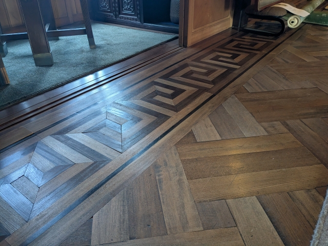 応接間の床は寄木細工が美しい仕上がり。複雑に組み合わさった木材に、高い技術を感じます。