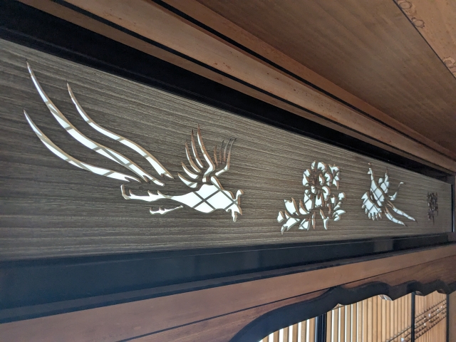 2階の大広間の欄間は美しい透し彫り。長い尾をなびかせた優雅な鳳凰が描かれています。