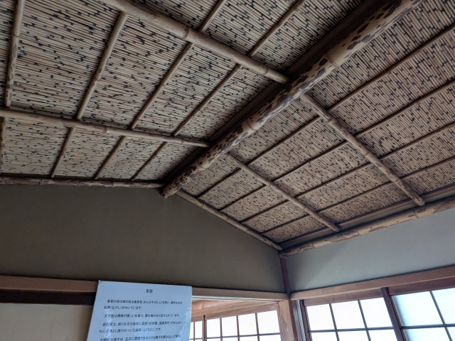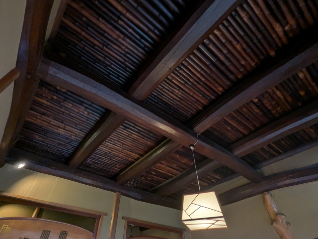 天井は囲炉裏の煤で黒くなった「煤竹(すすたけ)」。ここに囲炉裏は無いため自然に黒くなったわけではなく、古民家から移築したそうです。