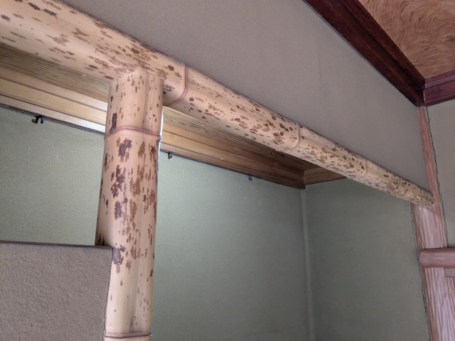 床柱の四角い木材、よく見ると四角い竹!枠に嵌めて成形し、溶液で模様をつけた「図面角竹」が採用されています。