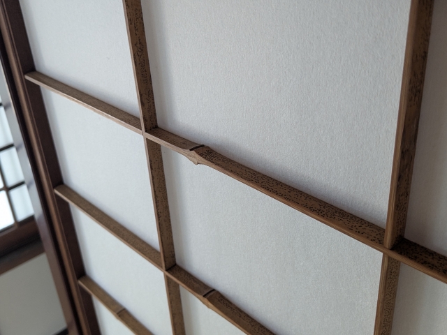 茶室の障子の組子は、「胡麻竹」を薄くして張り合わせています。これは、上から見ても下から見ても竹の表側が見えるようにとの意味があるそうです。