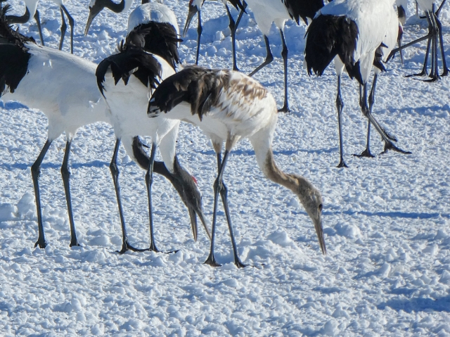 頭が赤くないのは、去年の春に生まれたまだ子どものタンチョウ。最初の冬を越える頃、親は子どもを攻撃して追い払い、子別れがはじまります。生まれてからたった1年で大きく育ち、親離れまで果たすというタンチョウの成長速度、恐るべし。