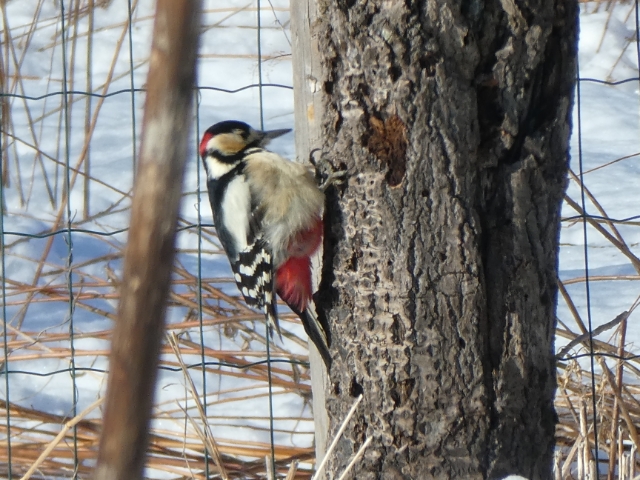 タンチョウと同じく頭の赤いキツツキ。木をつつきながらあちこち飛び回っていました。他にもシマエナガやオオワシが見られることもあるそうです。ここに来たら、ぜひタンチョウだけではなく様々な野鳥探しもお楽しみください!