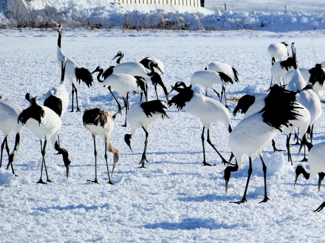 かなりたくさんのタンチョウが集まっています!辺りに響き渡るのは、大きな鳴き声。タンチョウは長い気管を持っており、それが管楽器のように働き、大きな声を出すことができるそう。