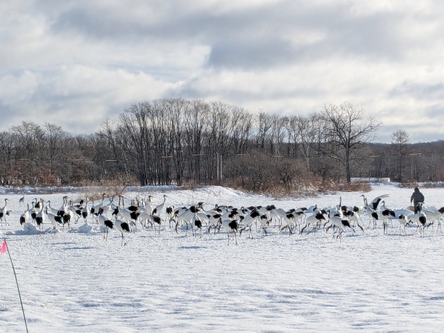 よく見るとエサをまいている人の姿が。餌付けときくと観光向けなイメージを持たれるかもしれませんが、実はこれが物凄く重要なところ。かつてタンチョウはエサ不足などの要因で数が減少してしまっていましたが、餌付けなどの保護活動の結果、ここまで数を増やすことができたのです。詳しくは次回と次次回の記事にて書きますね!